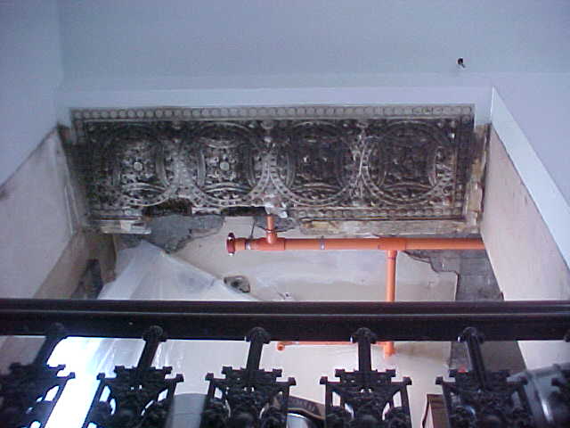The images above are of an old molded and crumbling plaster panel that weighed several hundred pounds. Some of the hundred year old panels survived, so in order to make everything look the same we made a mold on an existing panel still attached to the ceiling and re-work the carvings. The new construction required a lighter panel so we cast them out a spray in plastic with a modified plastic foaming agent. The new larger panels came in weighing approx 65 lbs with their wood frames.
